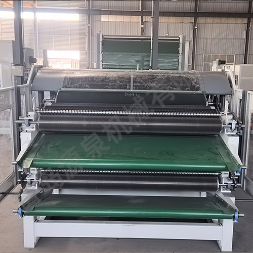 該機(jī)采用雙錫林梳理,雙道夫,雙雜亂出棉,雙羅拉剝棉,具有分梳能力強(qiáng),梳理精度高等優(yōu)點(diǎn)。喂入羅拉分上下兩組配對(duì),變頻調(diào)速,并裝有金屬探測(cè)裝置,具有自停報(bào)警功能。且自動(dòng)送入鋪網(wǎng)機(jī)斜簾,減輕操作工的勞動(dòng)強(qiáng)度。